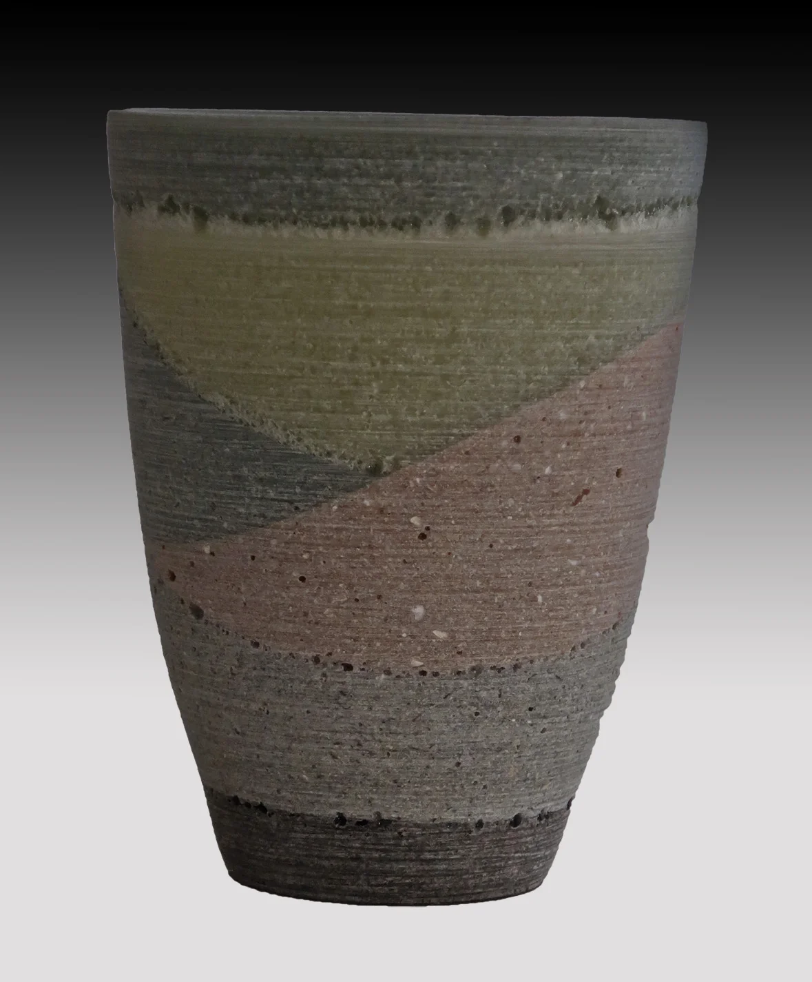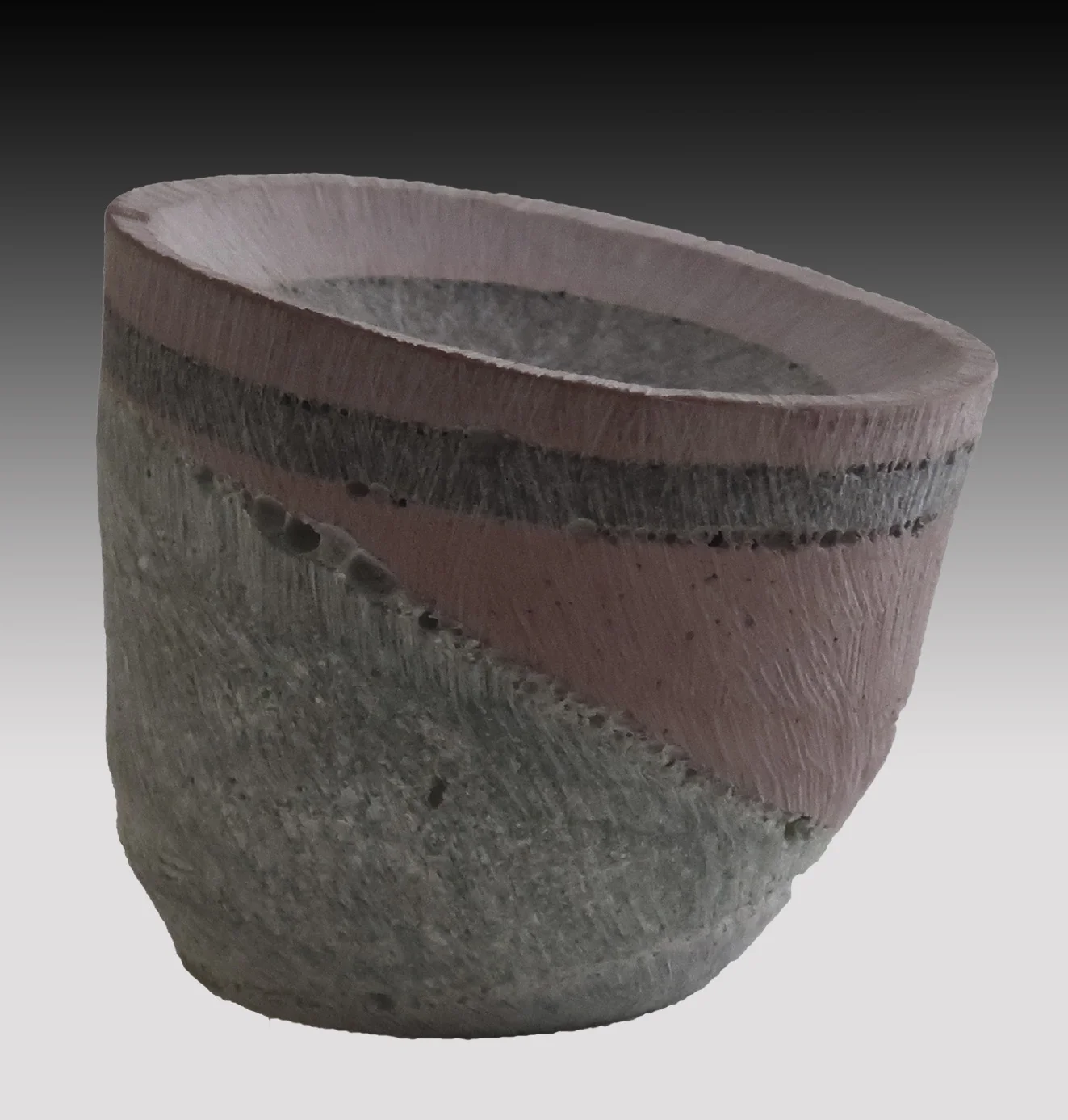 a small cylinder was built up in a mold over several days. some of the upper layers were tilted during poring. it is believed the brass filings reacted with the resin to give the green color. the vase was shaped on a lathe.